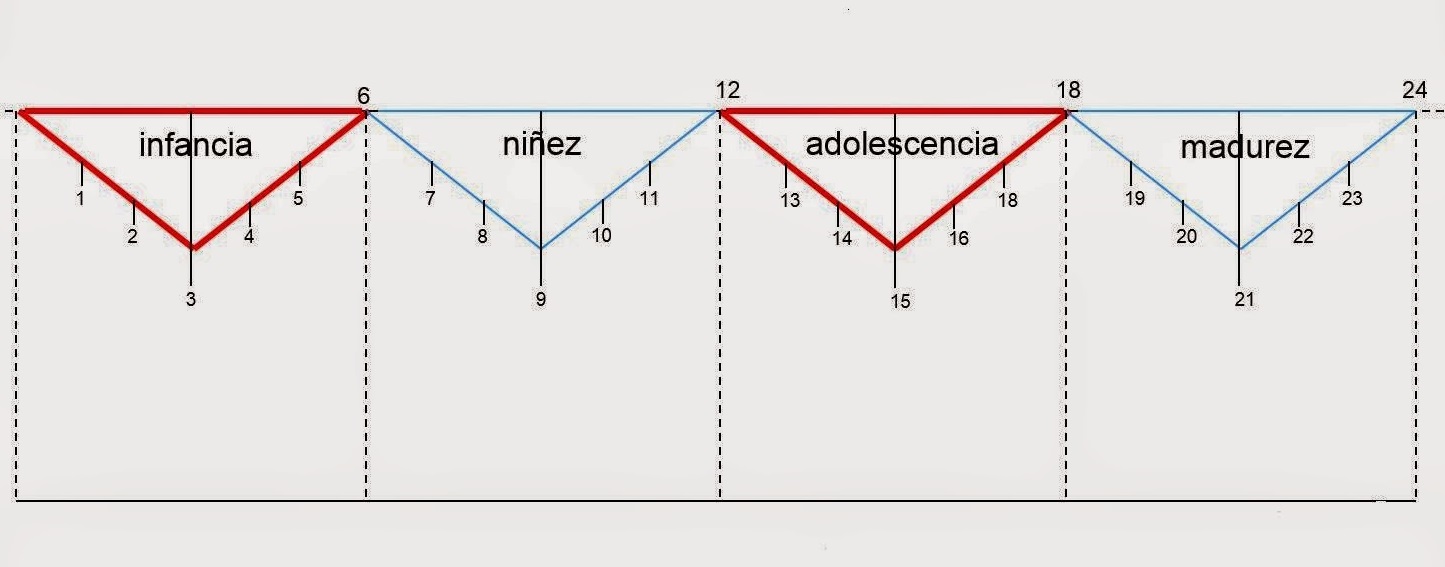 La primera y tercera etapa son las etapas de color rojo, de grandes cambios físicos y psíquicos en el individuo, son etapas de formación y se corresponden con la infancia y la adolescencia. En cambio, la segunda y cuarta etapa, correspondientes a la niñez y la madurez, son las etapas de color azul, destinadas al perfeccionamiento de las etapas anteriores y caracterizadas por la calma y crecimiento uniforme.
