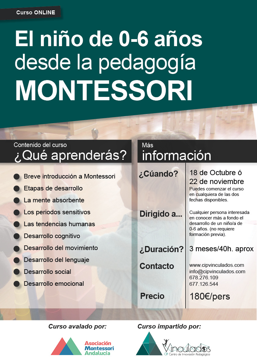 Por ello hemos elaborado un curso con el que descubrir y comprender al niño/a en su primera etapa, la que transcurre de los 0 a los 6 años, partiendo de la profunda observación y reflexión que en su día hizo María Montessori.