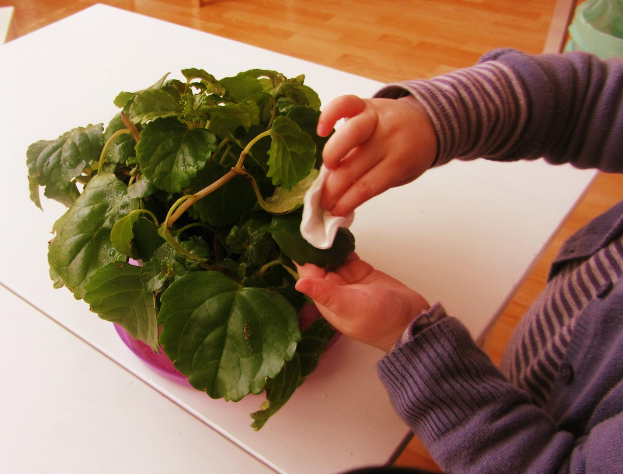 Esta actividad consiste en limpiar, de forma cuidadosa, las hojas de la planta. Para ello mojamos la hoja con el pulverizador y, con el disco de algodón, limpiamos la hoja delicadamente, por delante y por detrás. Cuando hayamos terminado no debemos olvidarnos de limpiar, con la esponja o el paño, el agua que hayamos derramado.