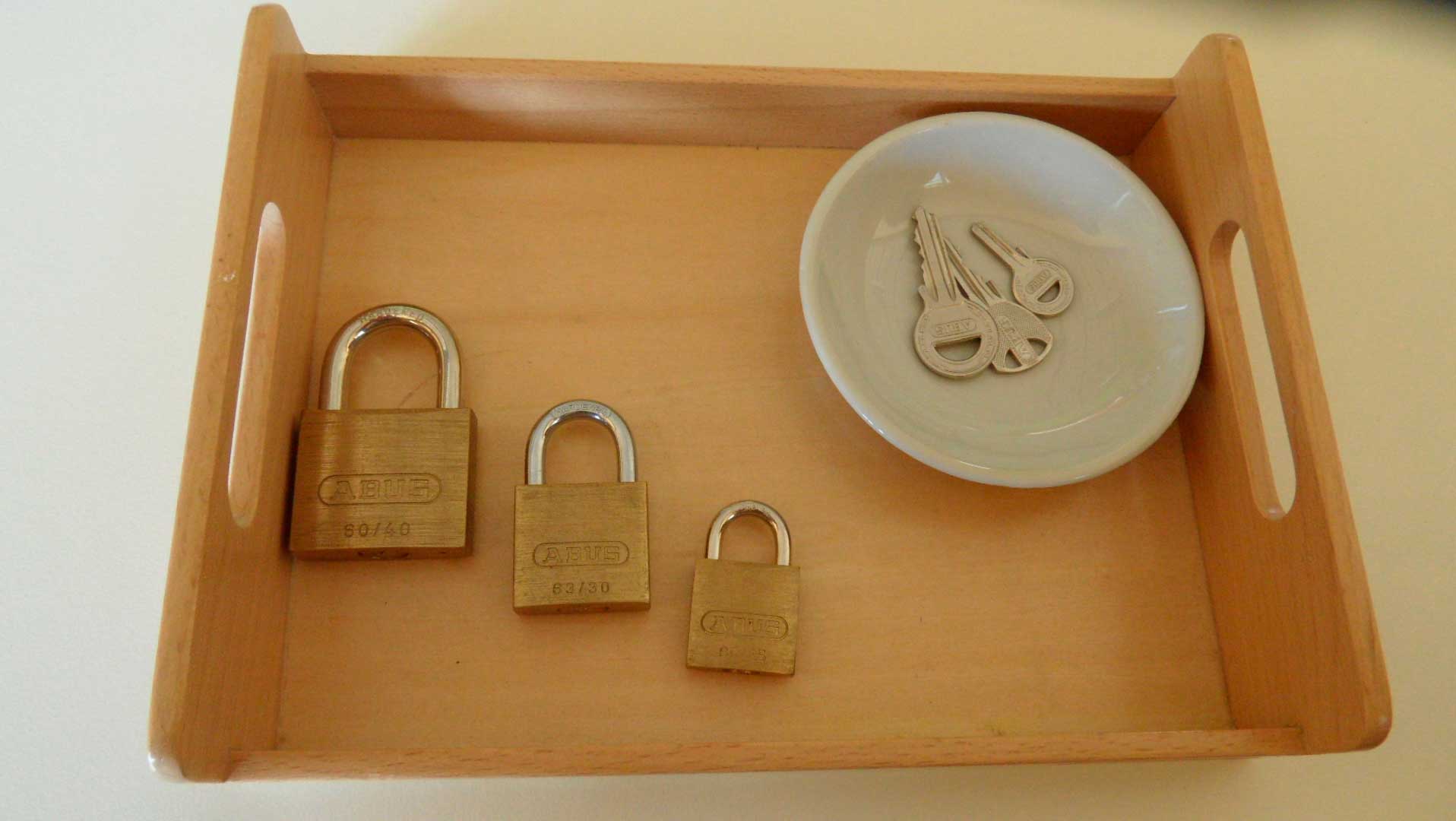 Necesitamos una bandeja con: candados de diferentes tamaños y las correspondientes llaves en un plato pequeño.