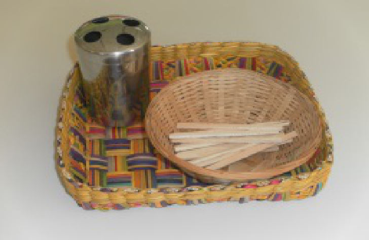 Necesitamos una bandeja con un bote con tapa que tenga agujeros y palitos de madera, o similares, en una cesta (cuantos más peques, agujeros más grandes y menos objetos para insertar; cuanto más mayores, agujeros más pequeños y mayor cantidad de objetos).
