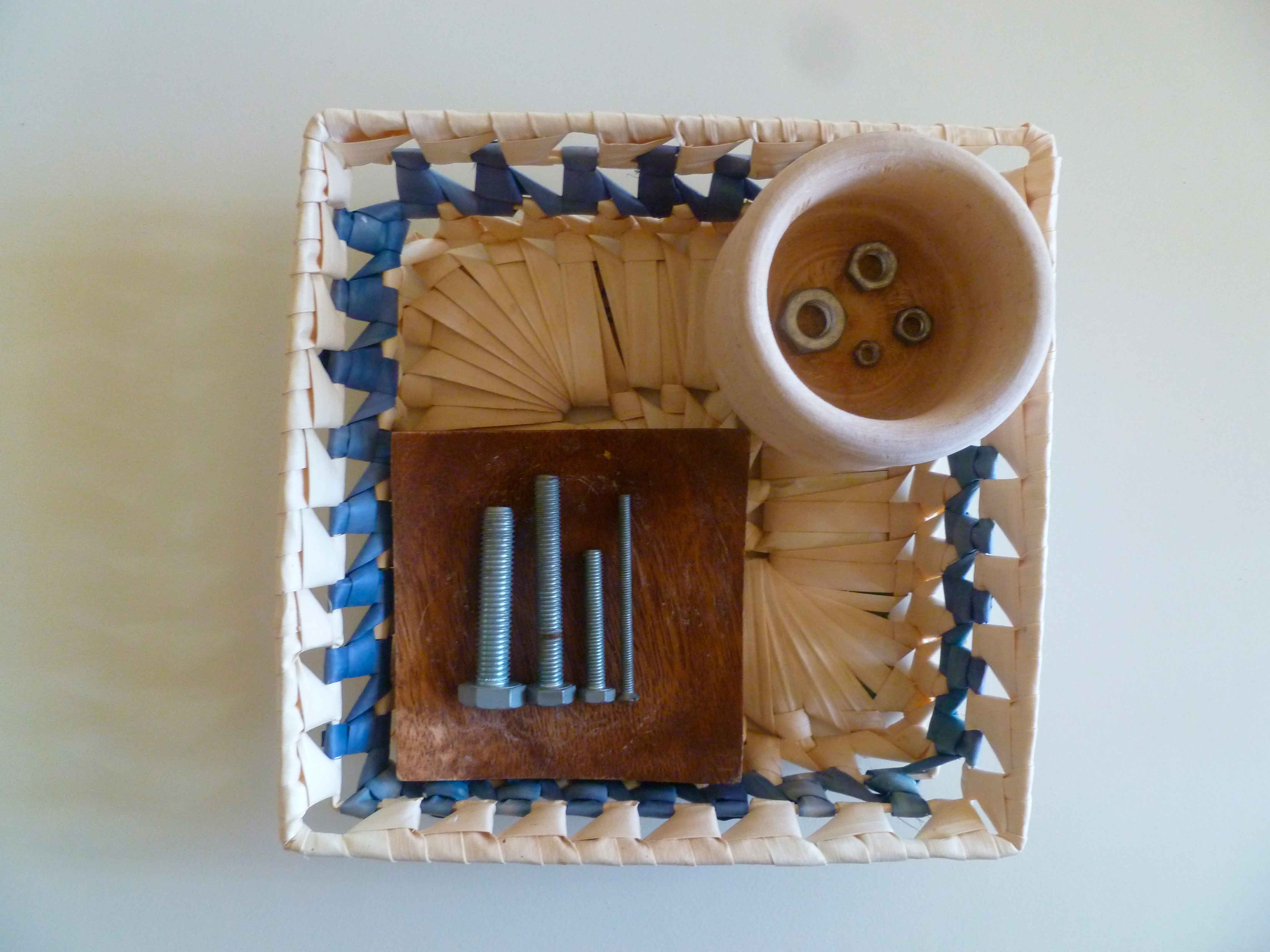 Necesitamos una bandeja con un plato con diferentes tornillos de diferentes tamaños y un cuenco con las tuercas correspondientes a los tornillos.